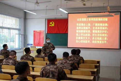 15日下午,士官学院党支部在3号教学楼103教室组织党员突击队宣誓活动,突击队队员们面对鲜红的党旗举起右手,庄严宣誓:我志愿加入疫情防控党员先锋突击队……冲锋在前,守土尽责”。一句句誓言在党旗下久久回荡。突击队队员还学习党支部自己整理归纳的《山东信院士官学院疫情防控歌》,切实把疫情防控工作熟记于心、牢记于胸、干在实处。